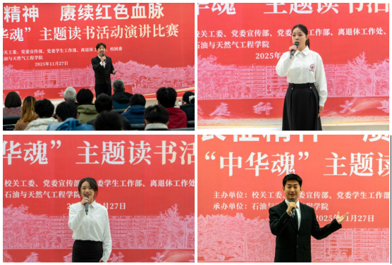 为深入学习贯彻党的二十届四中全会精神,引导广大青年学生铭记光辉历史、传承红色基因,11月27日,由学校关心下一代工作委员会牵头,党委宣传部、学生工作部、校团委共同主办,石油与天然气工程学院承办的“中华魂”主题读书活动演讲比赛在图书馆906报告厅举行。来自各学院的13位参赛选手齐聚一堂,以青春之声回望长征史诗,以赤子之心传承红色基因。